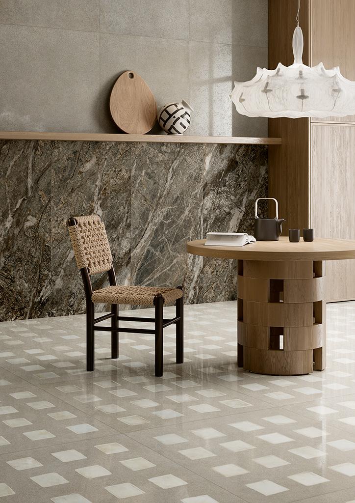 Atraktivna interpretacija betona u pet boja, s toplim nijansama i nježnom privlačnošću, stapa se s odvažnim kombinacijama s efektom kamena nudeći originalnu teksturu brazilskog kvarcita u tri nijanse. Pametna kalibracija boja stvara savršenu harmoniju između betonske i kamene pozadine, ispresijecane širokim zrncima i zasjenjenim efektima. Kolekciju THE BLEND upotpunjuju staklene betonske pozadine s četvrtastim staklenim umetcima s nepravilnim rubovima, sugerirajući nove interpretacije keramike nastale iz mješavine različitih, ali komplementarnih tekstura.