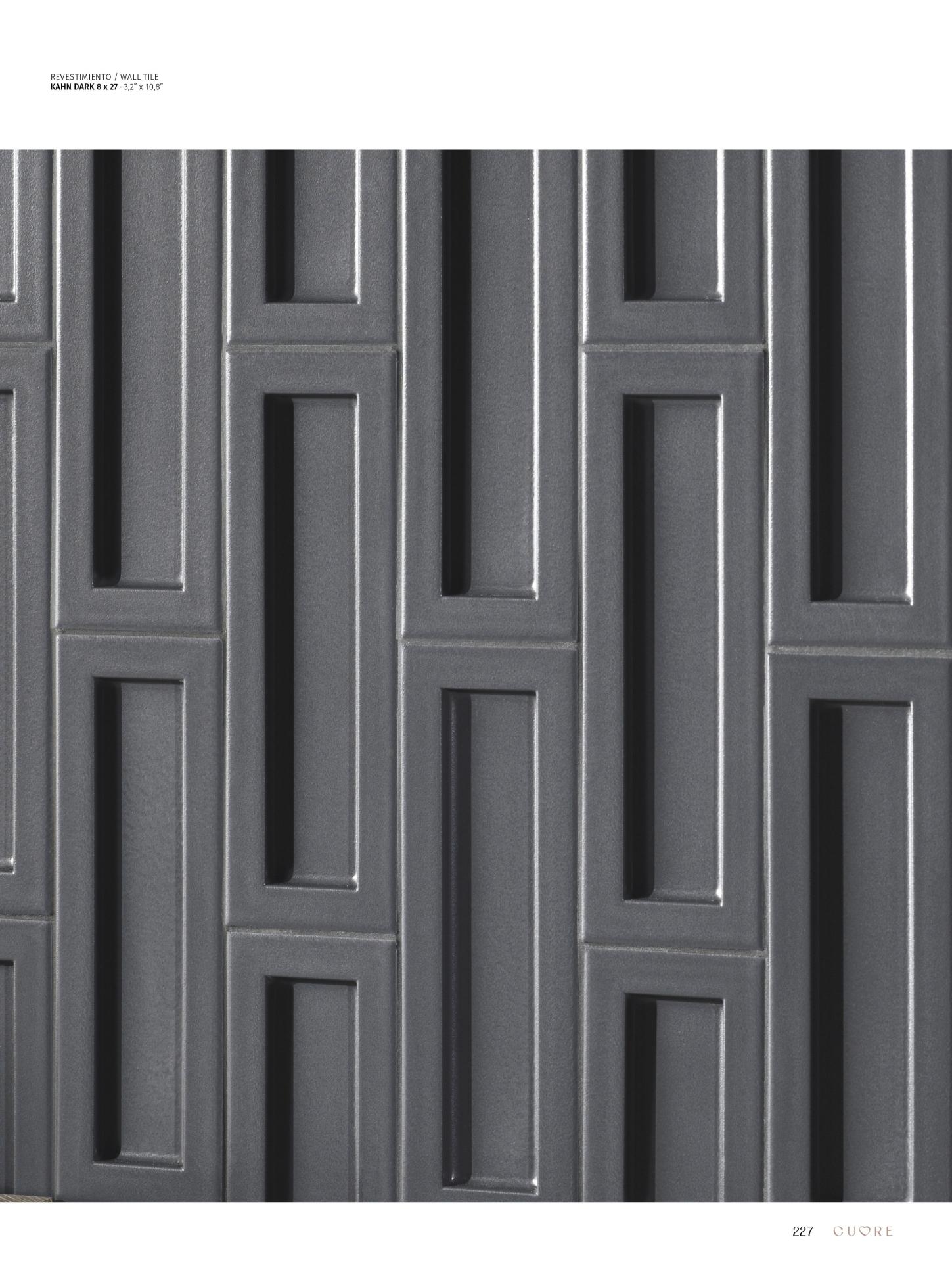 KAHN je kolekcija koja svojim preciznim i elegantnim dizajnom ističe ljepotu jednostavnosti. U formatu 8x27 cm, s pravokutnim usjekom u sredini, svaki komad stvara igru svjetla i sjene koja transformira prostore, dodajući dubinu i karakter. Kahn nije samo obloga već arhitektonski element koji poziva na obogaćenu vizualnu interpretaciju—savršeno za one koji traže dizajn.